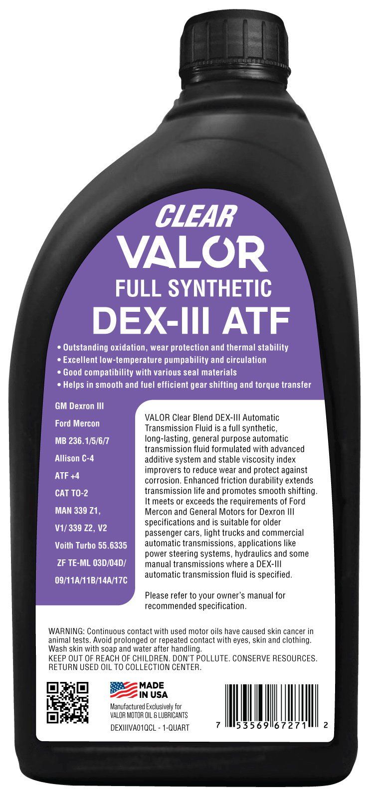 VALOR Clear Blend DEX-III Automatic Transmission Fluid is a full synthetic, long-lasting, general purpose automatic transmission oil formulated with advanced additive system and stable viscosity index improvers to reduce wear, protect against corrosion. Enchanced friction durability extends transmission life and promotes smooth shifting. It meets or exceeds the requirements of Ford Mercon and General Motors for Dexron III, Mercon specification and is suitable for older passanger cars, light trucks and commercial automatic transmissions, for use in applications like power steering systems, hydraulics and some manual transmissions where automatic transmission fluid is specified.