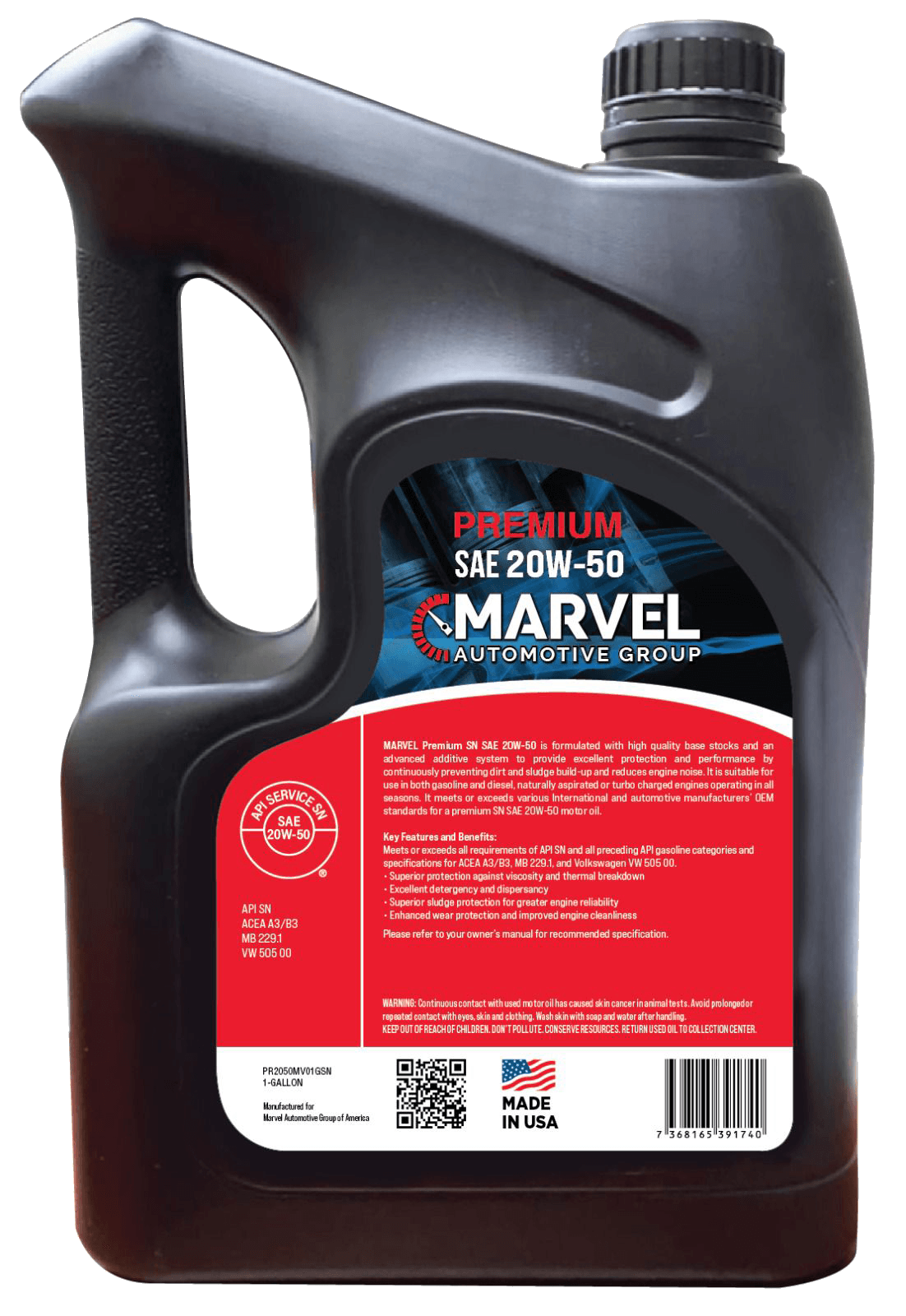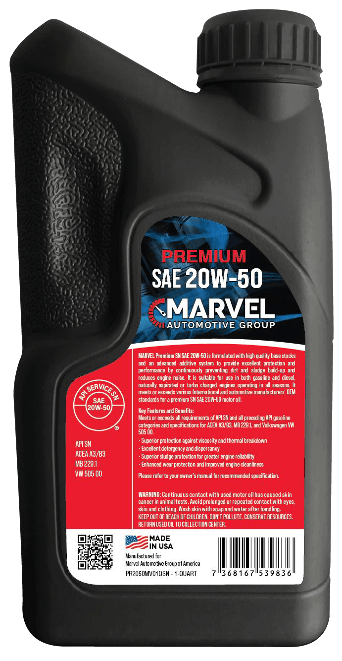 VALOR Premium SN SAE 20W-50 is formulated with high quality base stocks and an advanced heavy duty additive system to provide excellent protection and performance by continuously preventing dirt and sludge build-up and reduces engine noise. It is suitable for use in both gasoline and diesel, naturally aspirated or turbo-charged engines operating in all seasons. It meets or exceeds various International and automotive manufactureres' OEM standards for a heavy duty SN SAE 20W-50 motor oil.